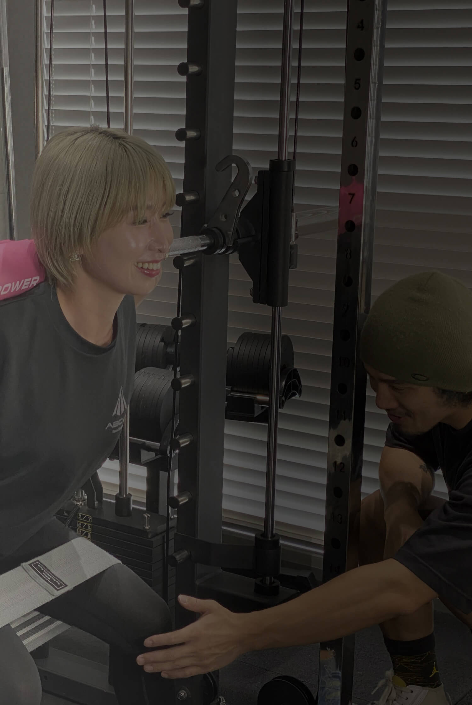 トレーニングは怪我無く、⼀⽣健康的な⽣活を続けられるよう「効かせる」トレーニングフォームの習得、メニューの組み⽅をお伝えしていますので、無理な重量を扱って頂く事はありません。